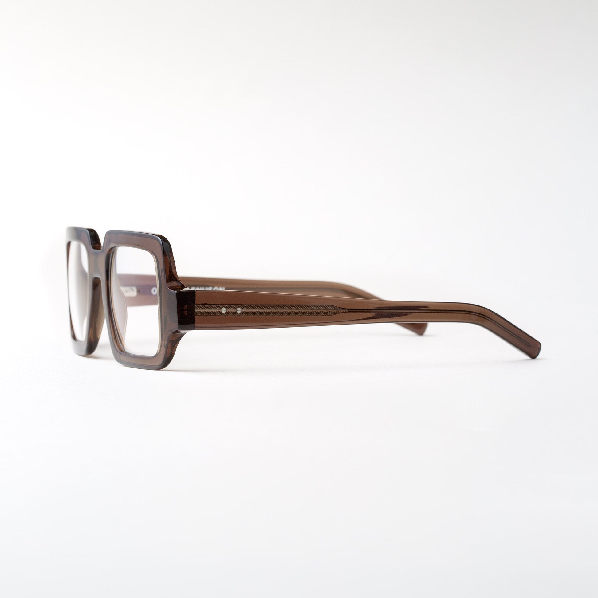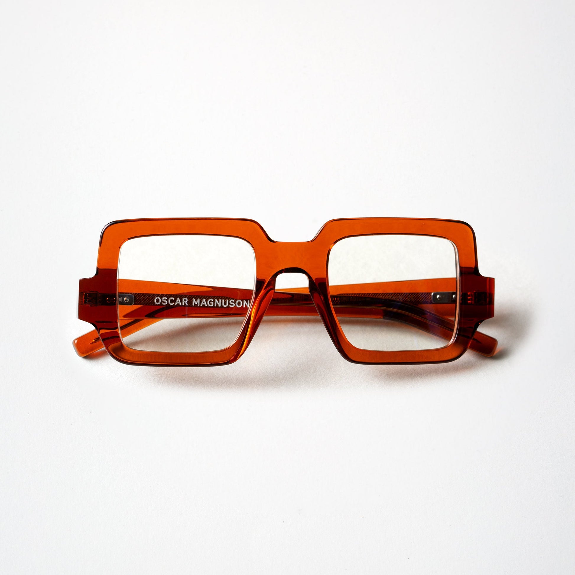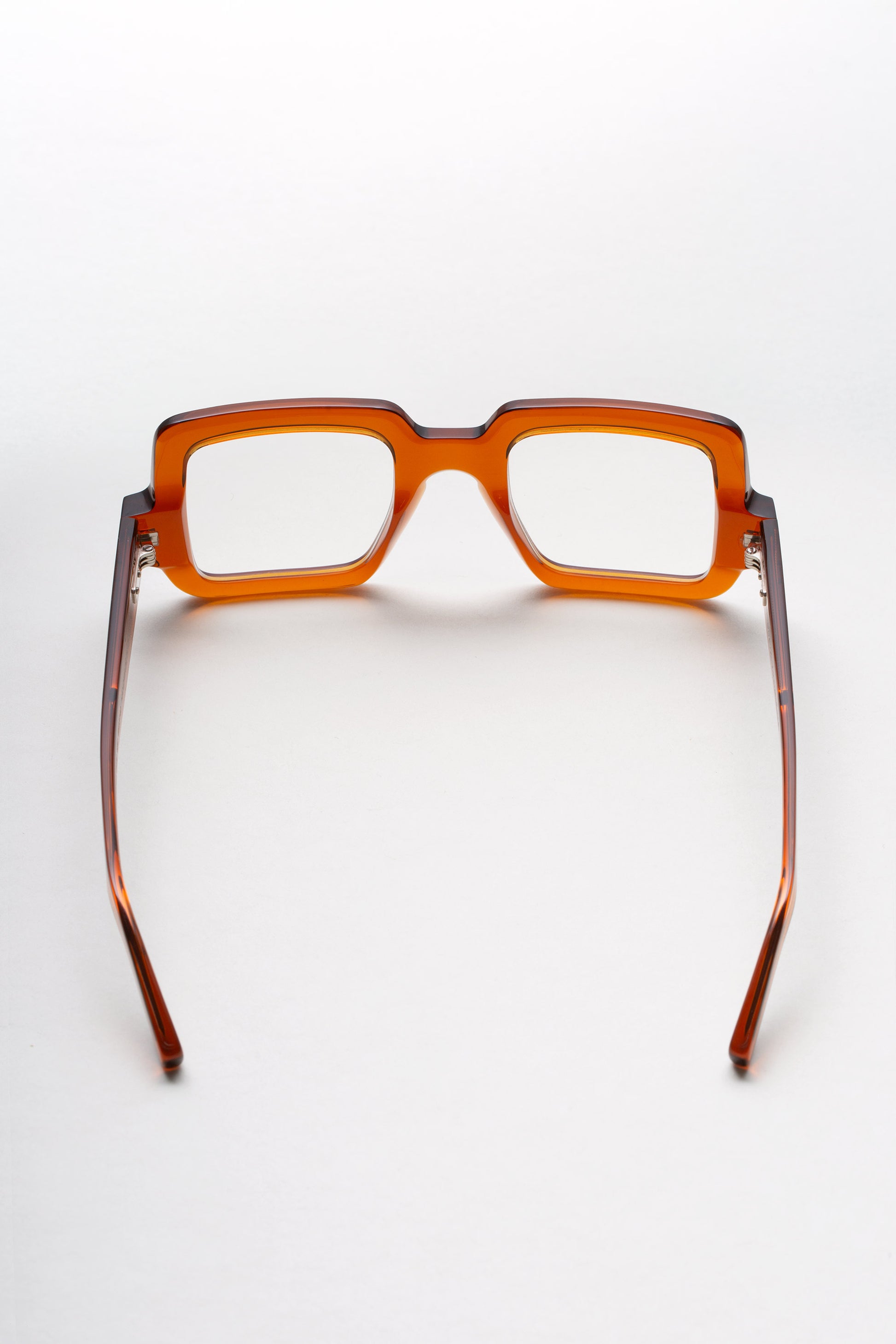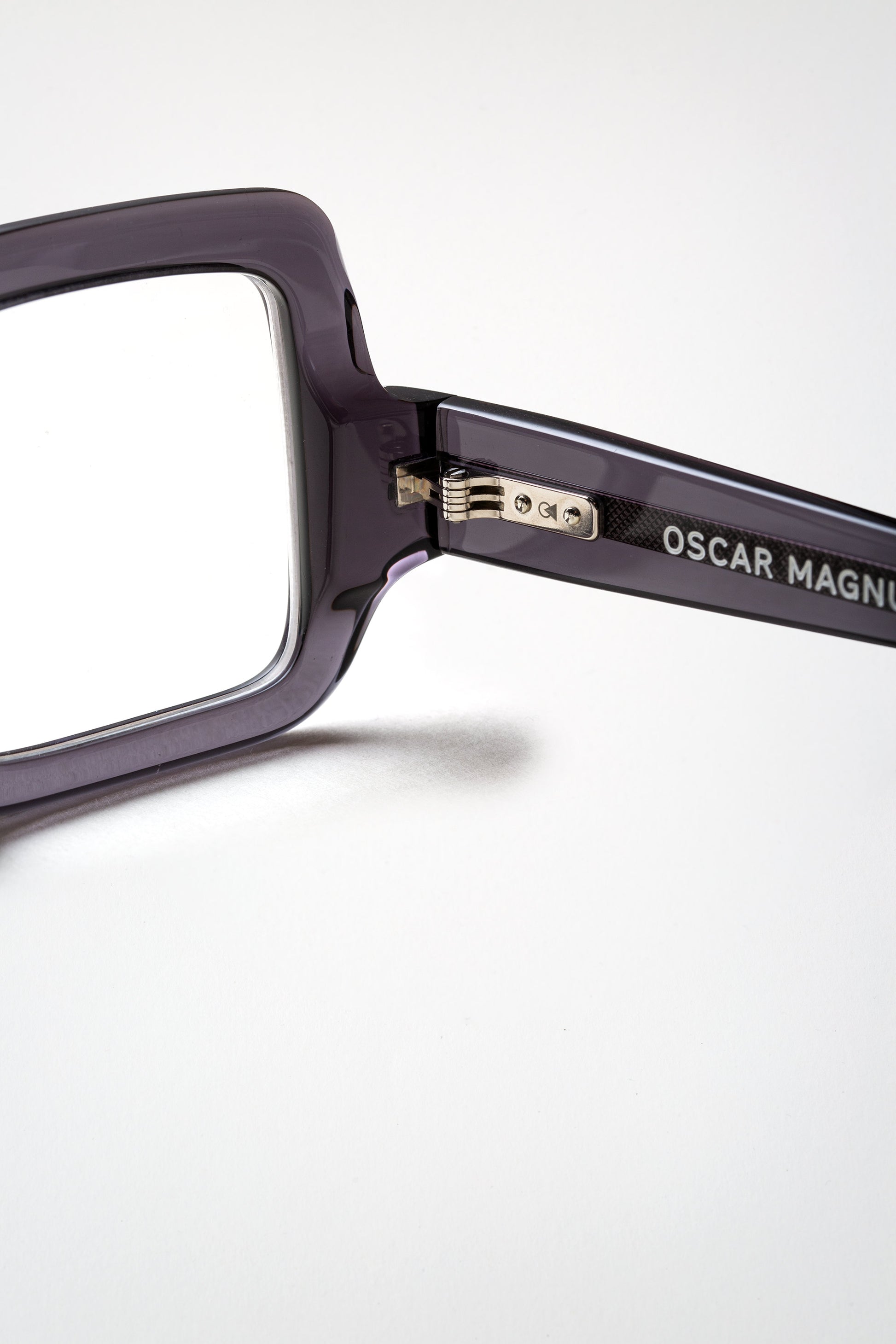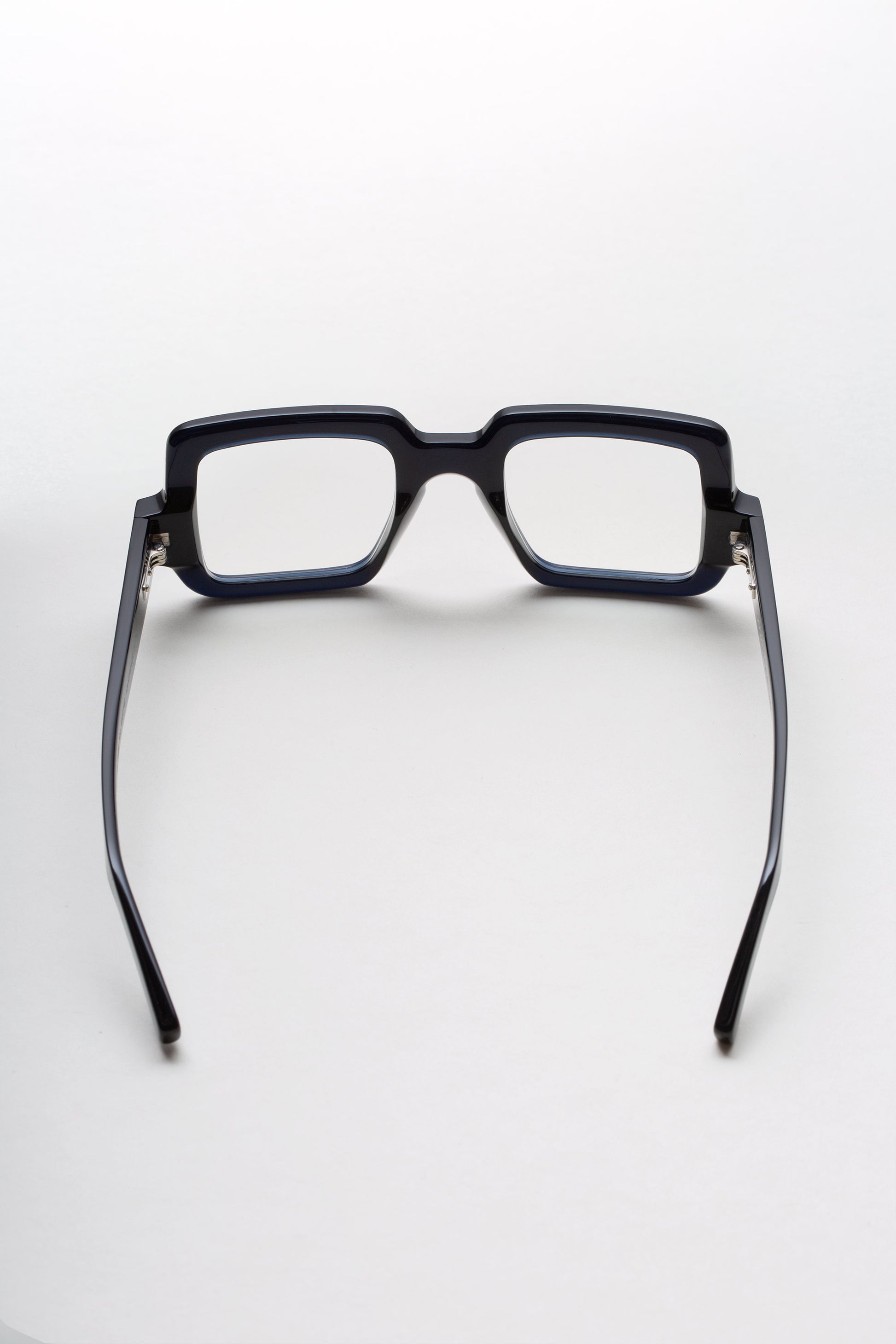 The 'Donna' eyeglasses from the OM.6 collection. Handmade with bio-acetate, featuring an ample square silhouette, bold construction with dimensional contours, and tapered temples.