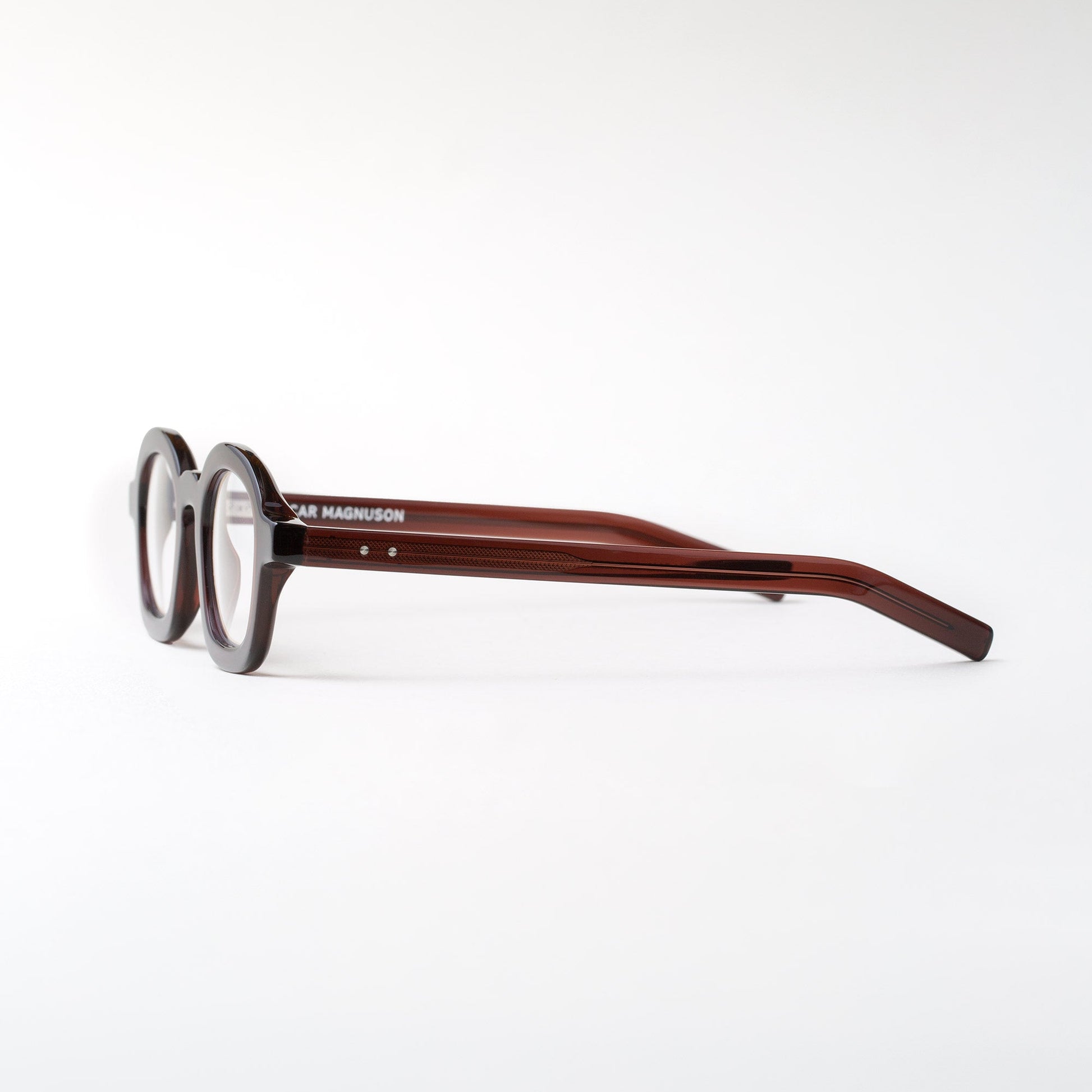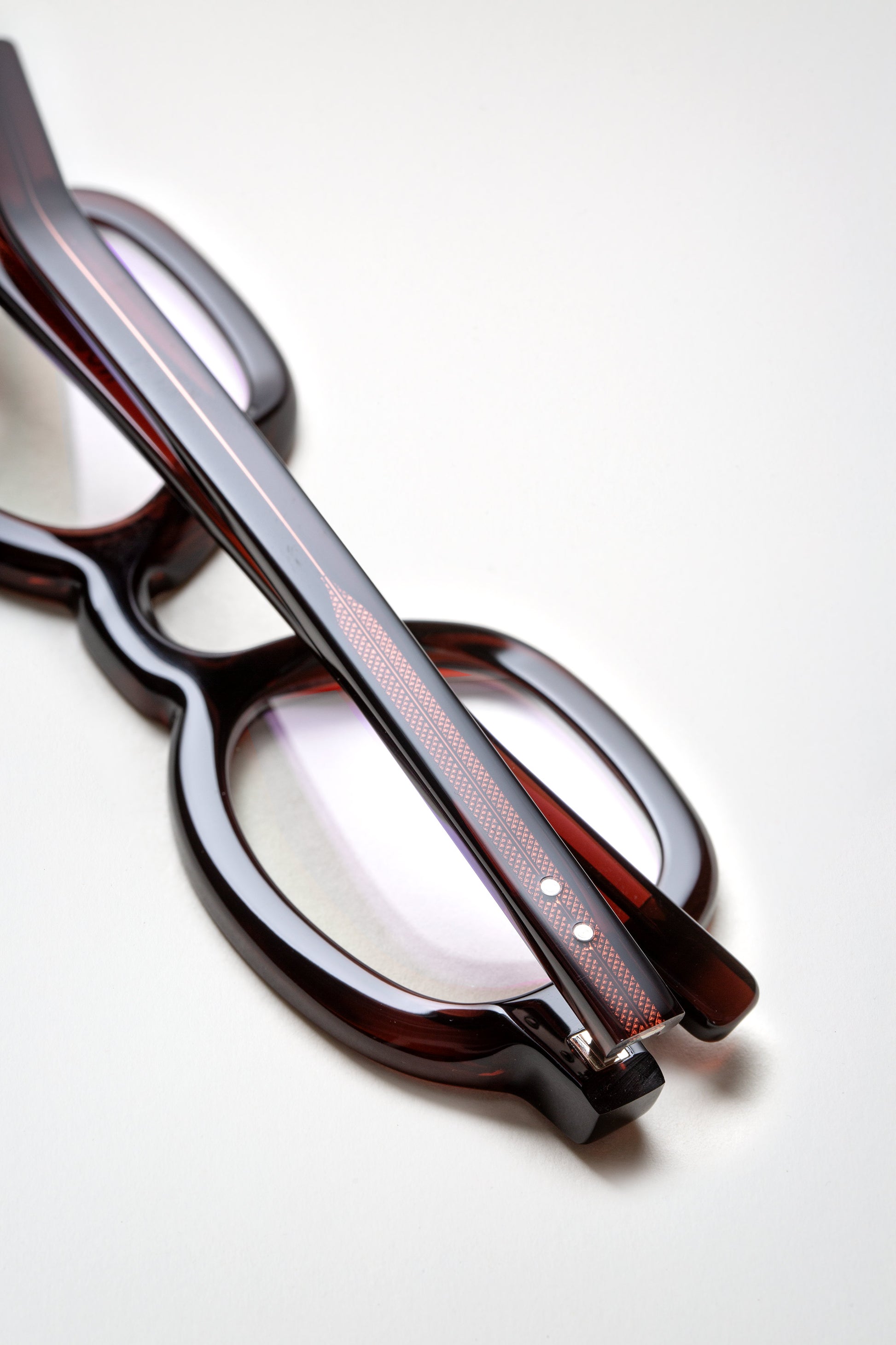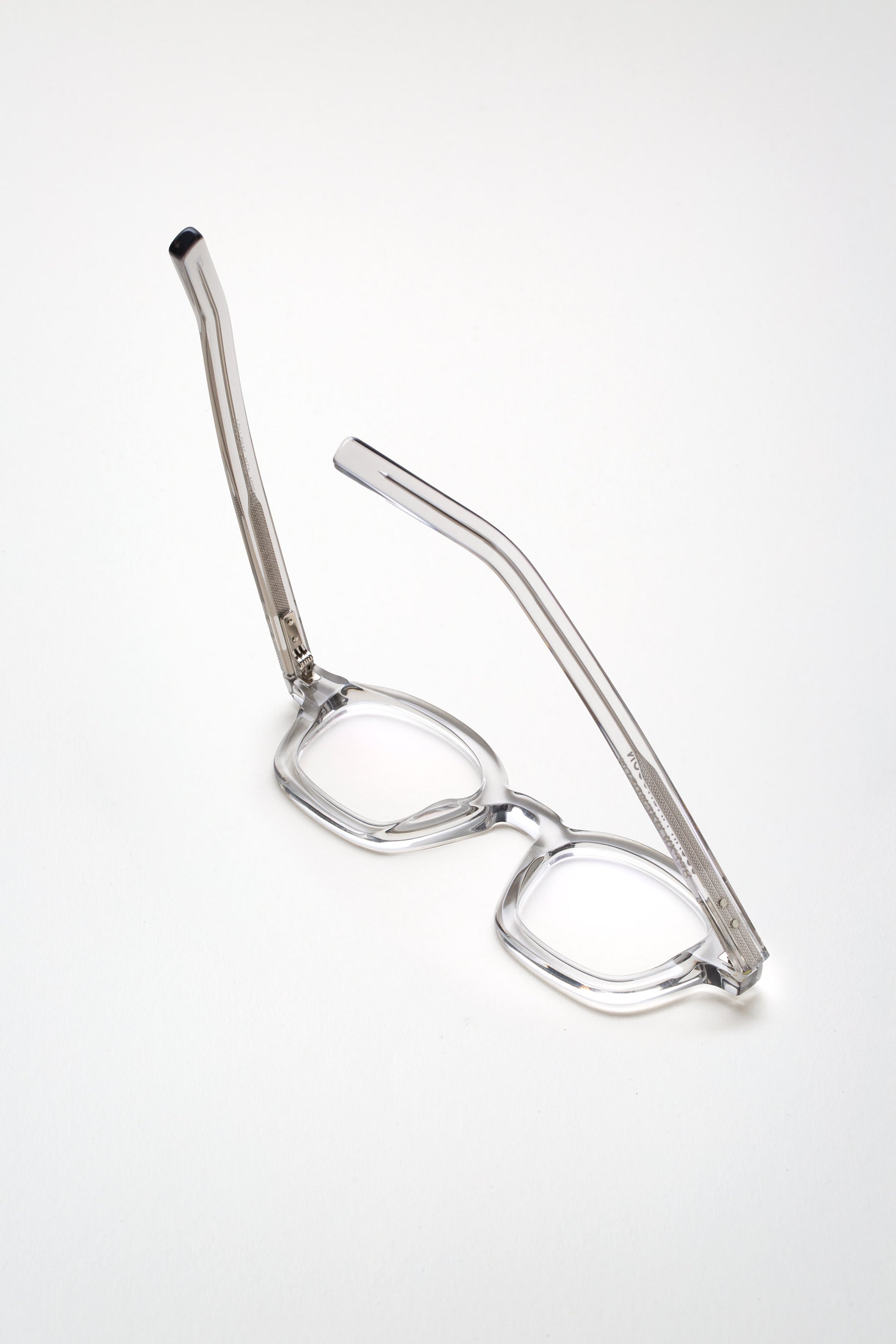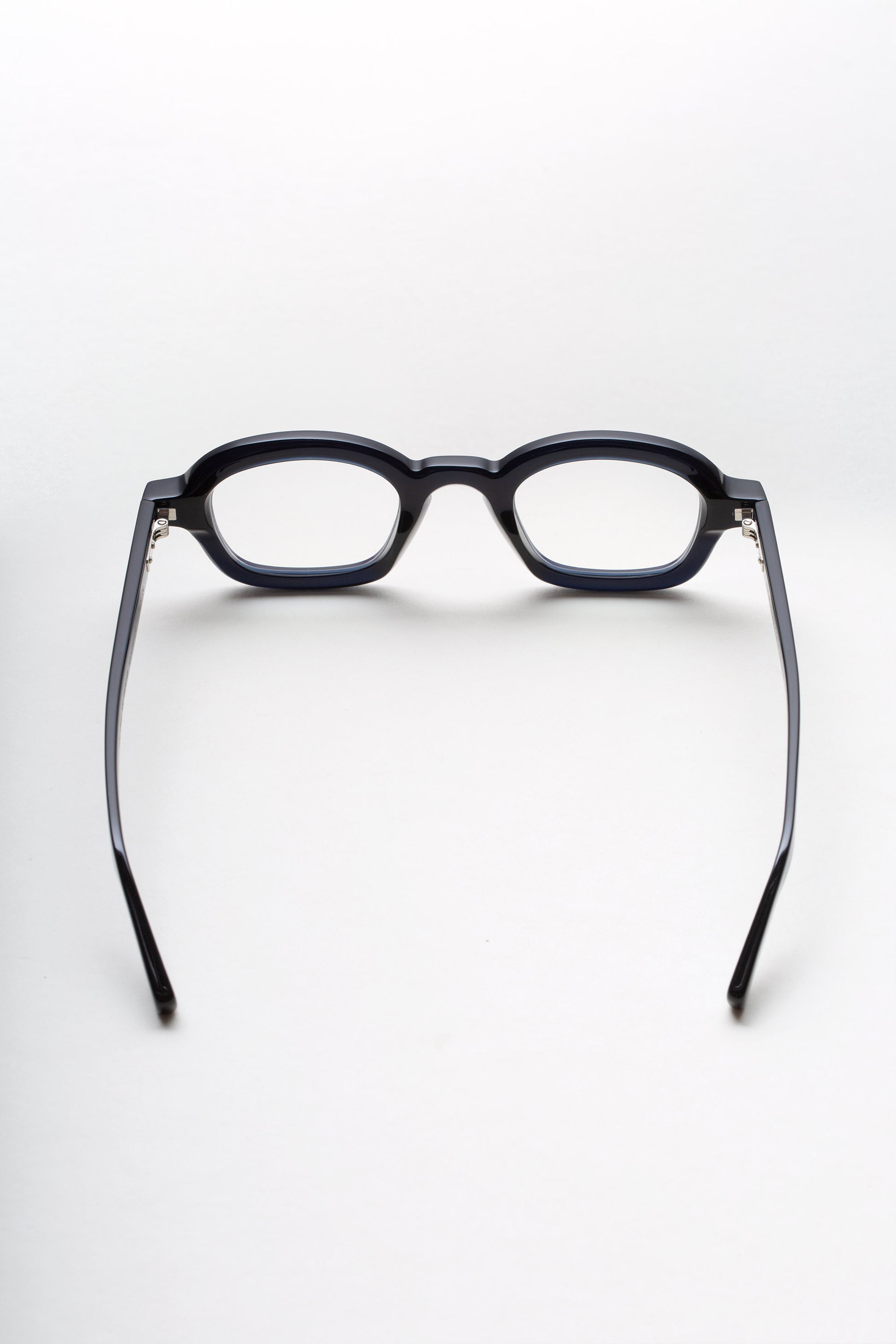 The 'Lou' eyeglasses from the OM.2 collection. Handmade with bio-acetate, featuring a subtle blend of square and round silhouettes and a moderate construction.