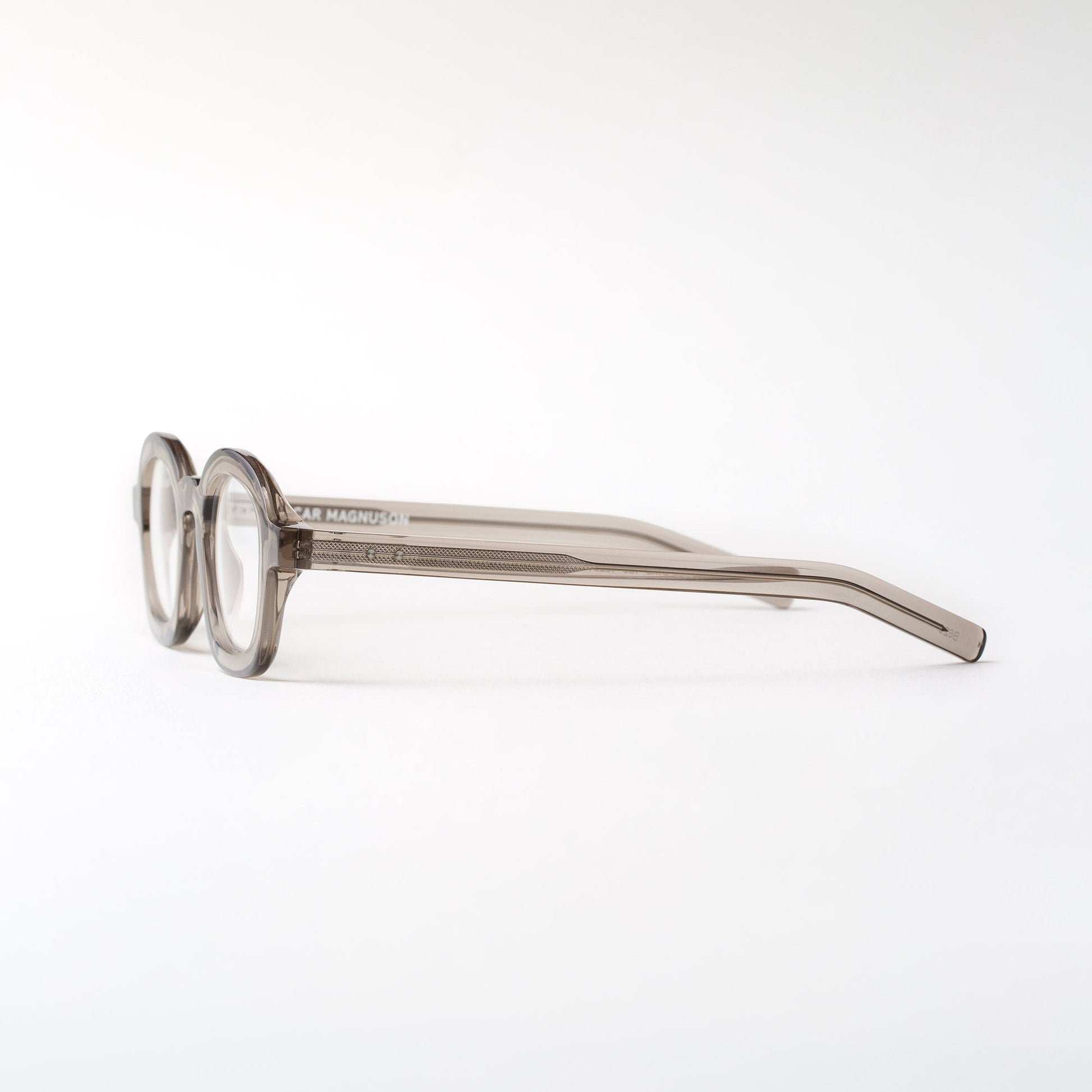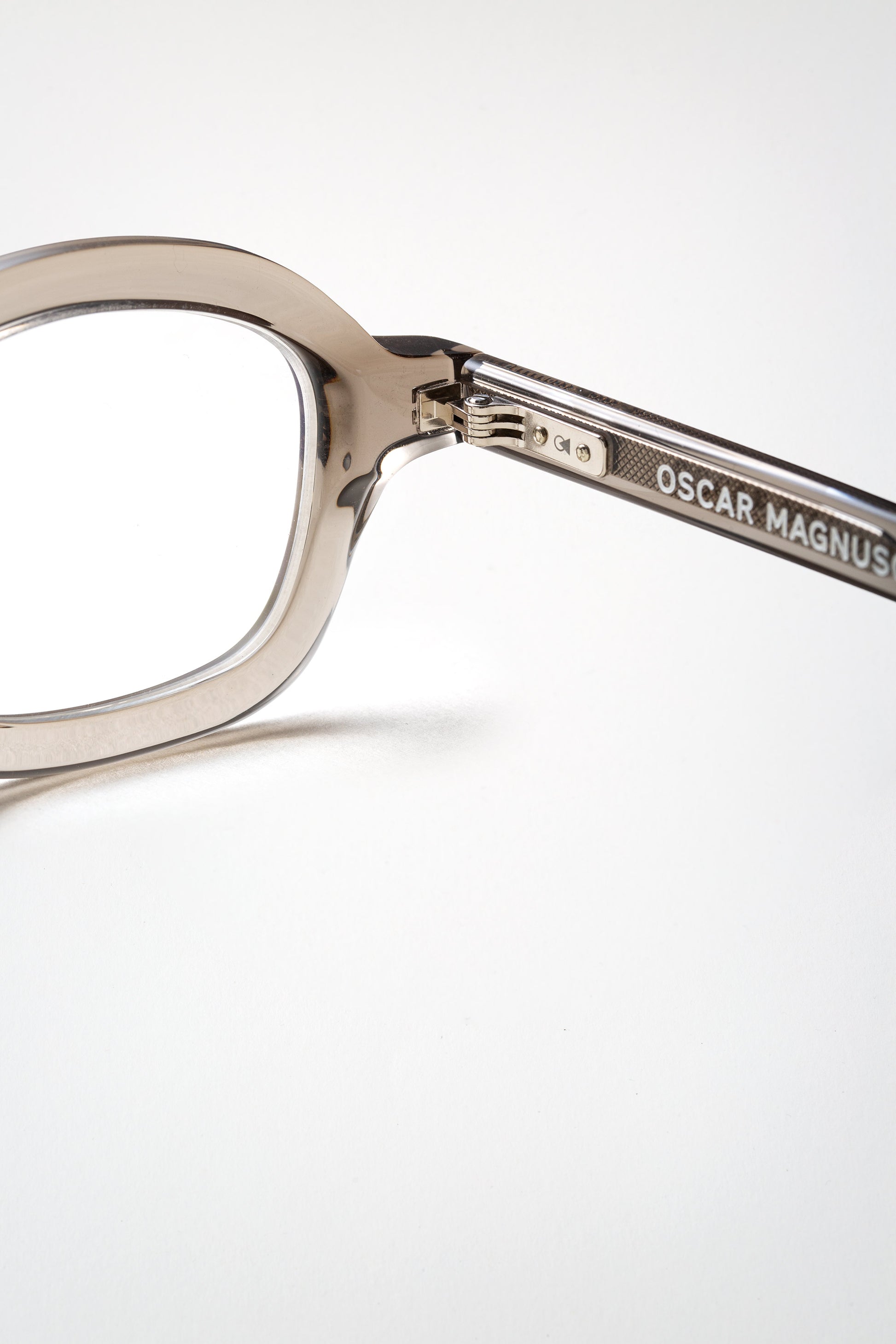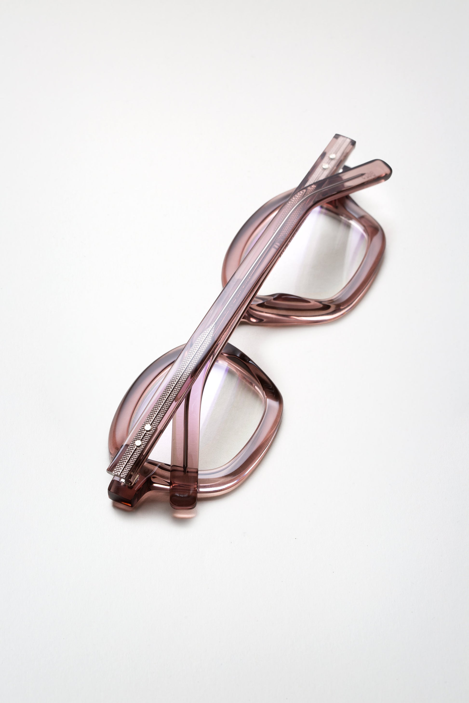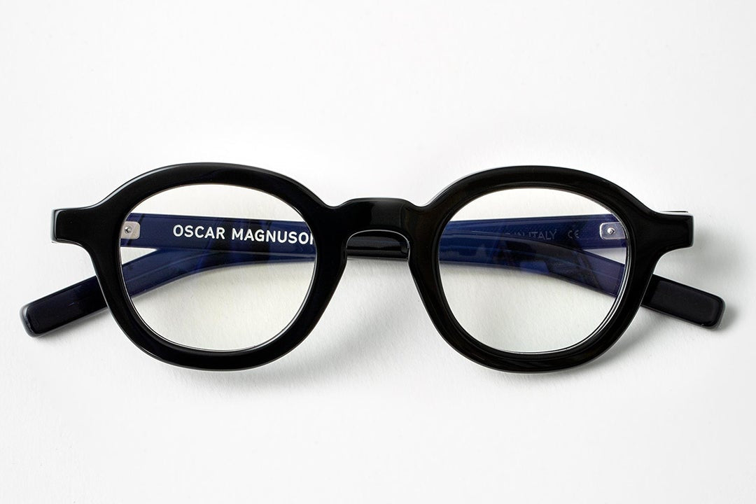 The 'Lou' eyeglasses from the OM.2 collection. Handmade with bio-acetate, featuring a subtle blend of square and round silhouettes and a moderate construction.