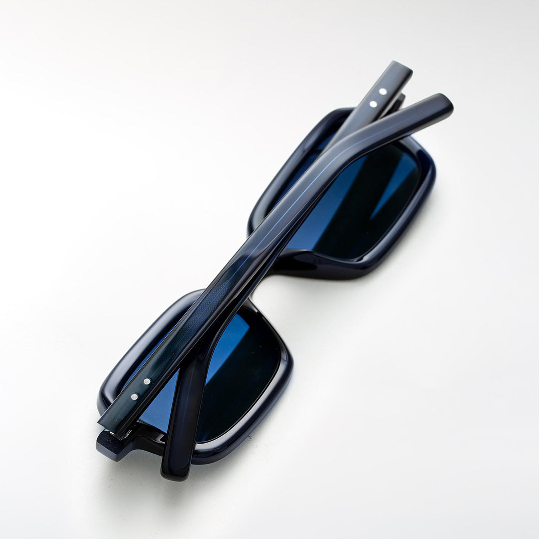 The 'Wes' sunglasses from the OM.3 collection. Handmade with bio-acetate, featuring an soft rectangular design with balanced dimensions, solid construction, and stick temples.